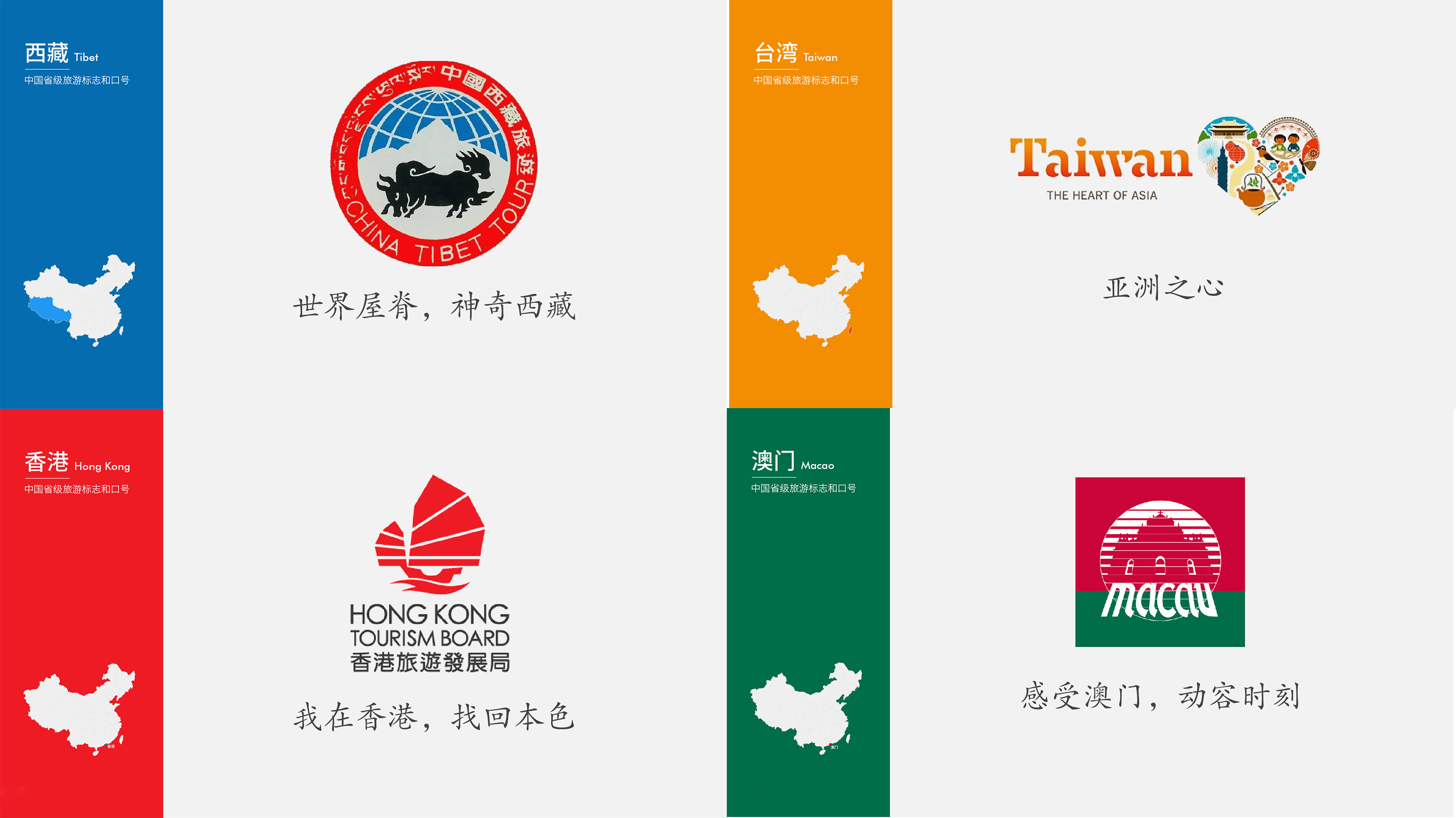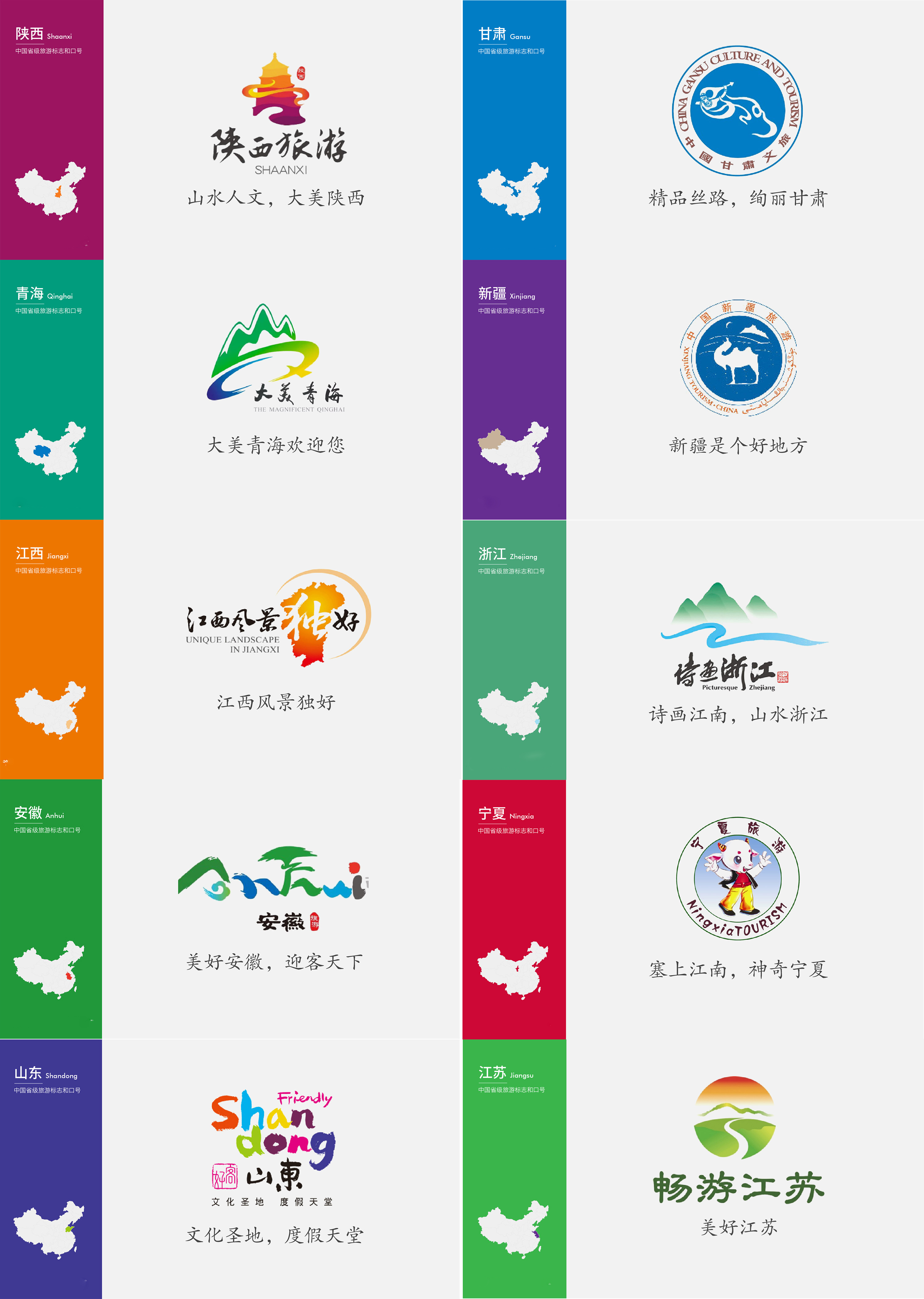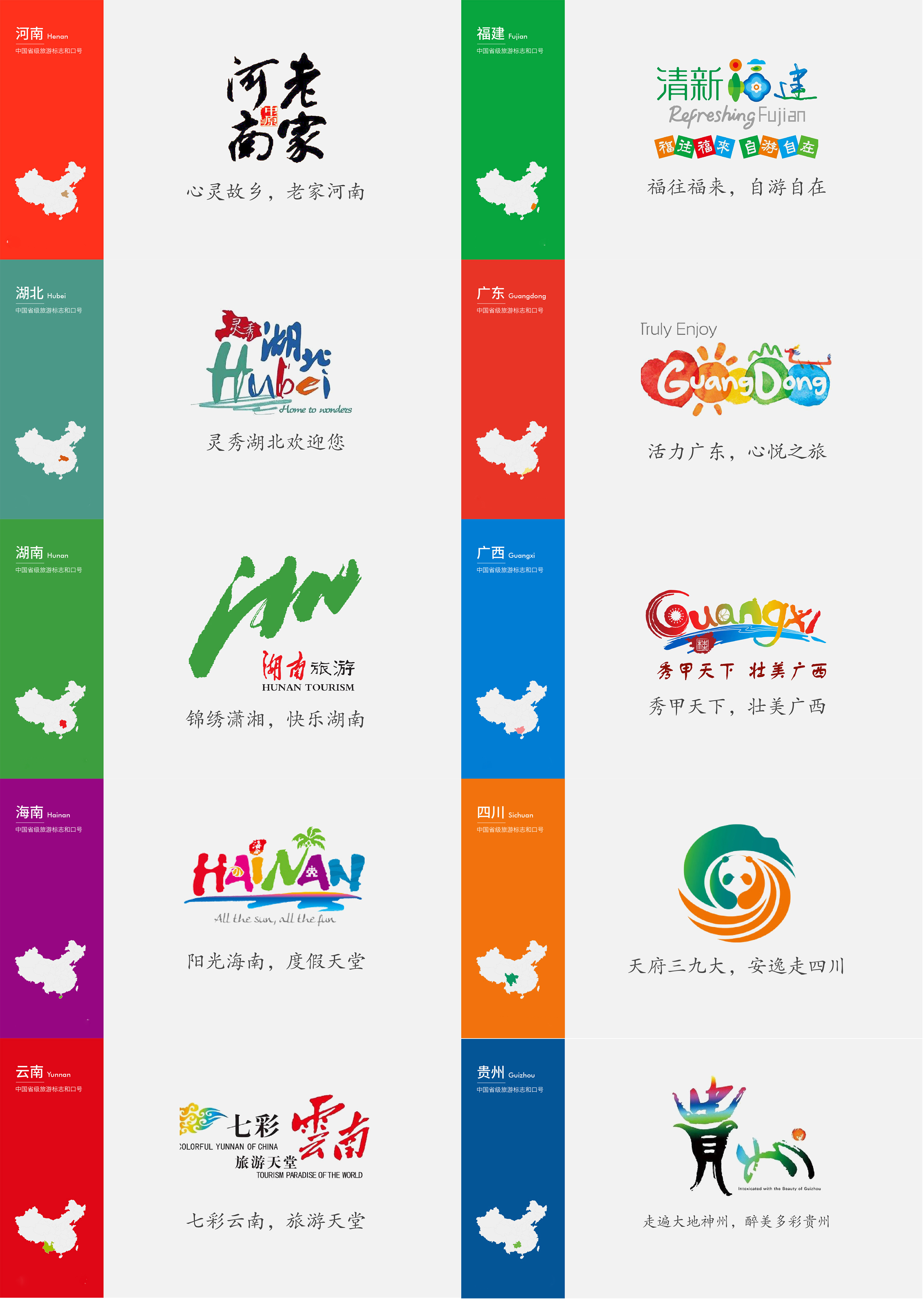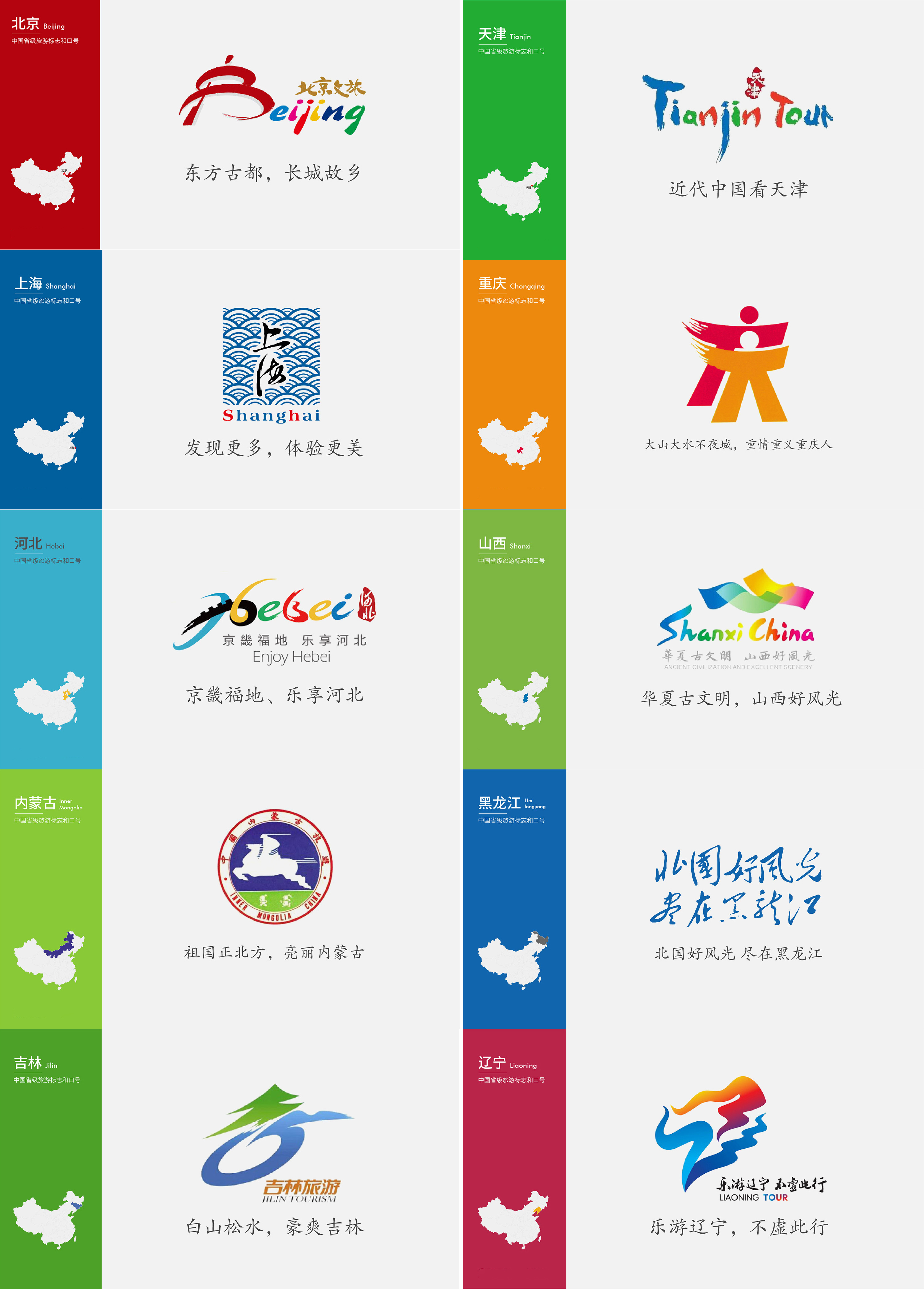 旅游城市的視覺(jué)設(shè)計(jì),由于地域、文化的復(fù)雜性,需慎之又慎,因?yàn)檫@不僅代表著一個(gè)地區(qū)的旅游形象,也是一個(gè)地區(qū)的整體形象。一個(gè)優(yōu)秀的VI系統(tǒng),可以讓一個(gè)城市更加出彩,而一個(gè)差的設(shè)計(jì),則可能讓一個(gè)優(yōu)秀的城市黯淡,畢竟它代表的是一個(gè)區(qū)域的形象。看看國(guó)內(nèi)其他34個(gè)省級(jí)行政區(qū)域旅游品牌的logo設(shè)計(jì)及推廣口號(hào):